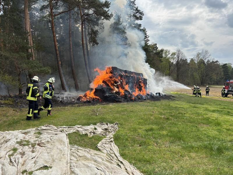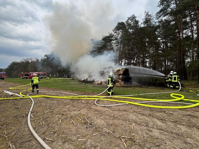 Bei Eintreffen der ersten Kräfte stand ein Strohballenstapel mit ca. 180 Quaderballen bereits in Vollbrand und hatte auf den angrenzen Wald übergegriffen.